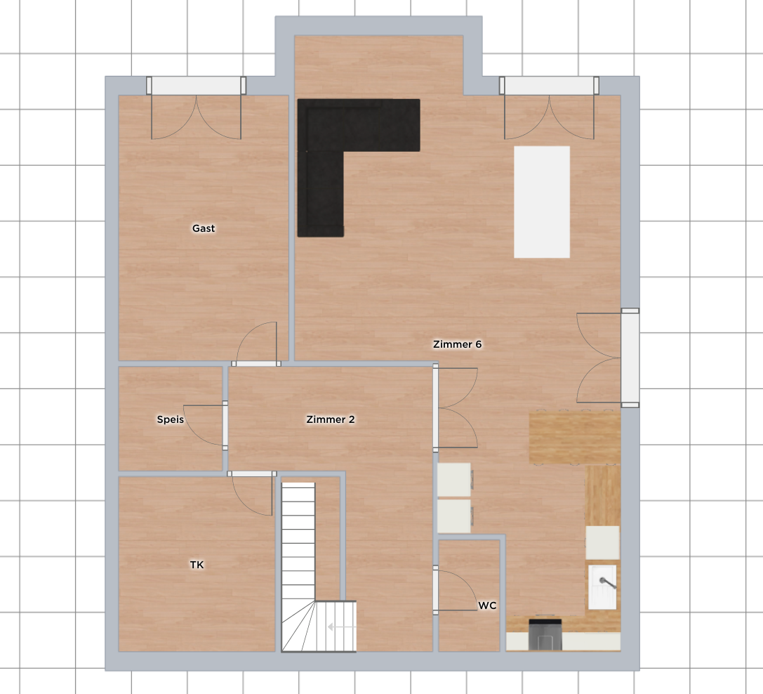 Grundriss: Gast, Zimmer 2, Zimmer 6, Speis, TK, Küche mit Esstisch, WC, Treppe