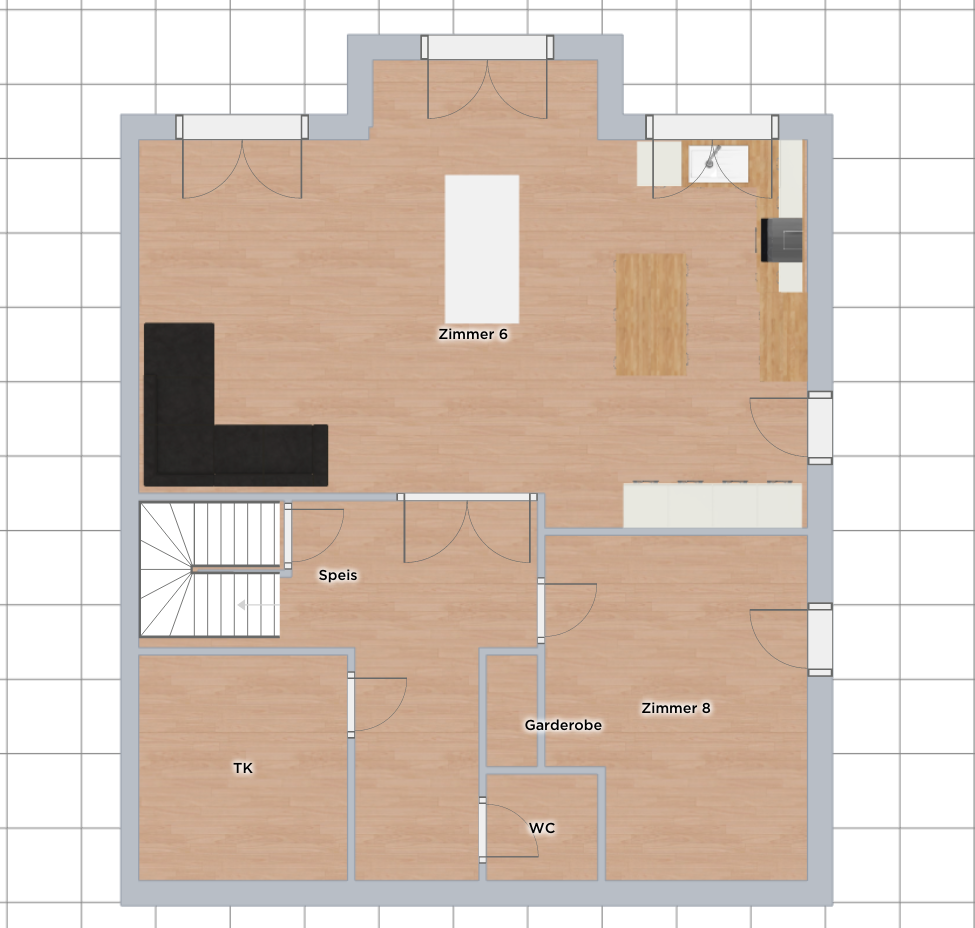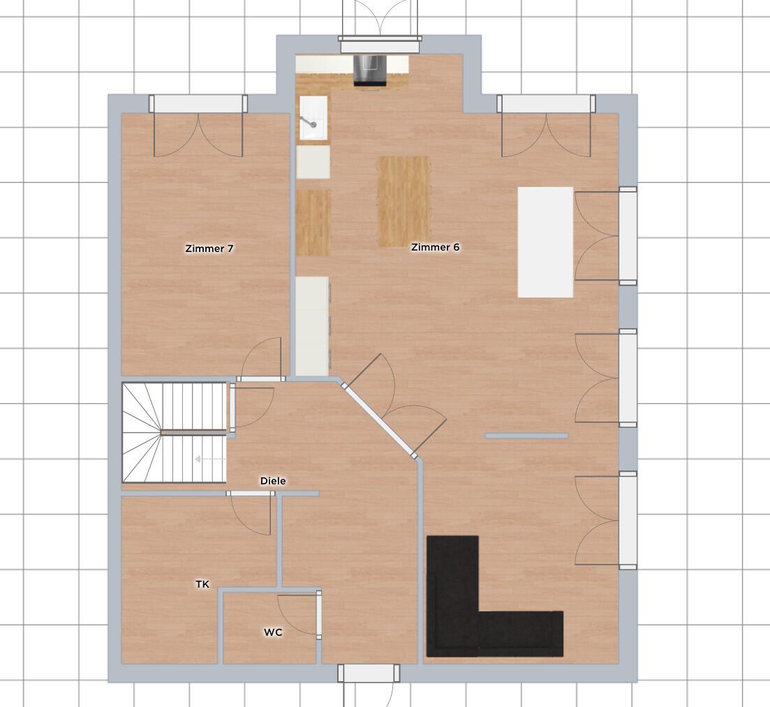 Dazu habe ich - allerdings nicht mit allen Details - auf die Schnelle mal den Vorschlag von @Nordlys visualisiert, Küche und Hauswirtschaftsraum in der Position zu tauschen:Ein passables Sofa passt da aber auch nicht rein - der Zugang zum Garten West wird im Bereich der Küche/Ess gesehen.