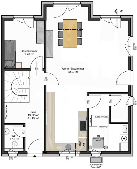 Für Essplatz bedarf es schon mind. 3 Meter in der Breite, das Gästezimmer ergibt sich mit der Breite... Küche ist neben dem Flur wiederum sehr schmal...