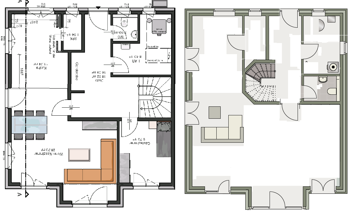 Für das DG ist auch eine schnell geschnipselte "Zeichnung" sehr viel aufwendiger zu erstellen, daher erst mal nur soviel. Man sollte hier aber schon gut erkennen können, daß die Operation, die Treppe an den Rand zu legen, mit mehr Fläche zur "Erschließung" der Treppe bezahlt wurde. Im DG führt das ja zudem auch noch zum vermurksten Badgrundriss.