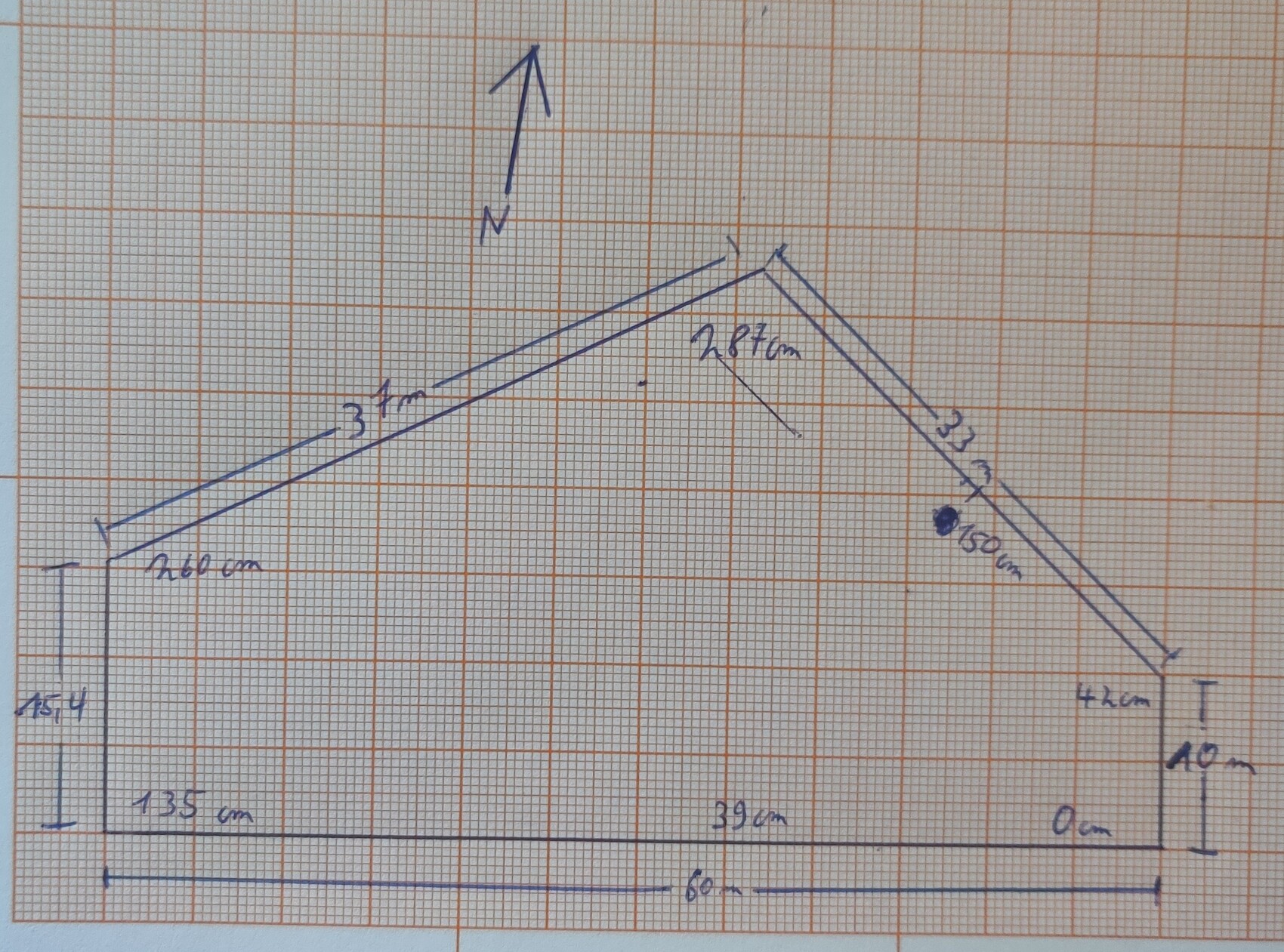 Zum Höhenprofil: Ganz im Südosten ist der tiefste Punkt, hier als 0 bezeichnet, alles andere sind die Höhenunterschiede in Bezug auf diesen 0 Punkt. Die Nordöstliche Linie (von 42cm bis 287cm verläuft linear in seiner Steigung. Hoffentlich könnt ihr damit etwas anfangen 🙂