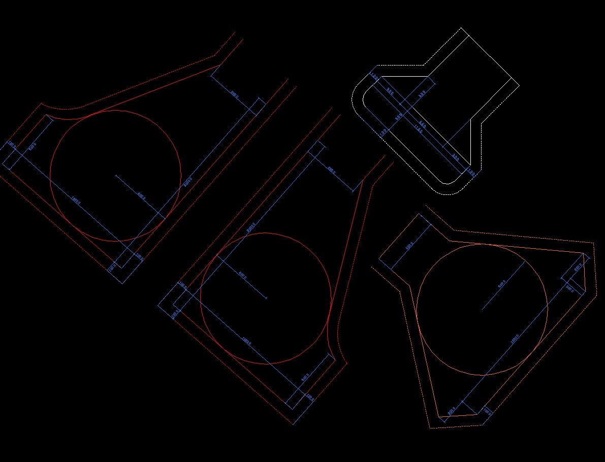 CAD-Grundrisspläne mit runden Formen und Maßlinien auf schwarzem Hintergrund