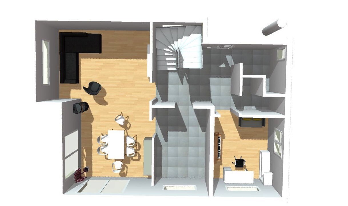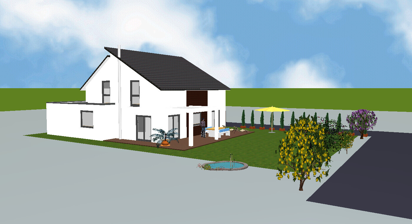 In den Grundrissen ist lediglich noch der Eingang im Norden. Diesen wollen wir aber wieder nach Osten ausrichten. Möglicherweise opfern wir die Speisekammer für eine größere Diele.