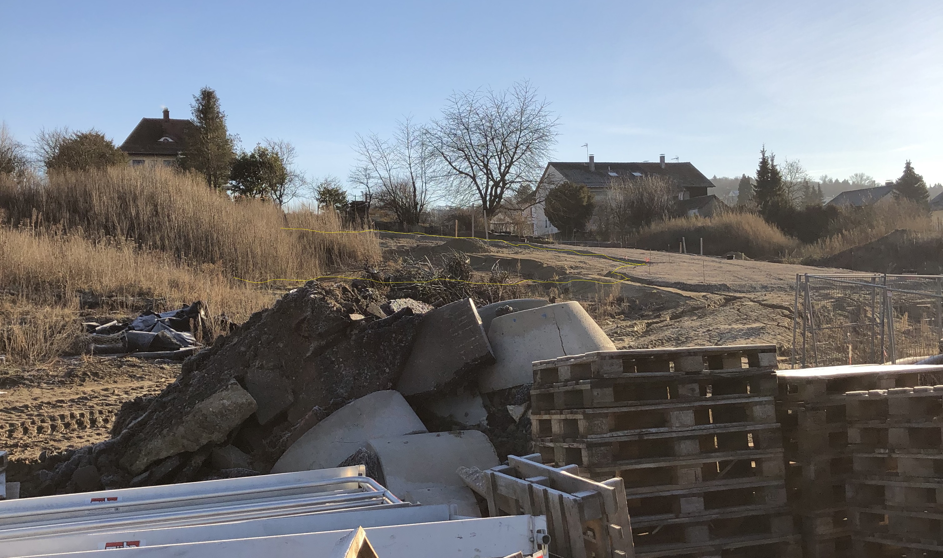 Wir sind dann auch noch mal so wie es die Zeit erlaubt hat kurz ins Neubaugebiet. Anbei auch ein Foto auf dem zumindest Ansatzweise das Grundstück erkennbar ist. Zur Orientierung ich stehe jetzt auf der geschlängelten Straße und mache das Bild nach oben zum Grundstück von Süd-Westen aus.