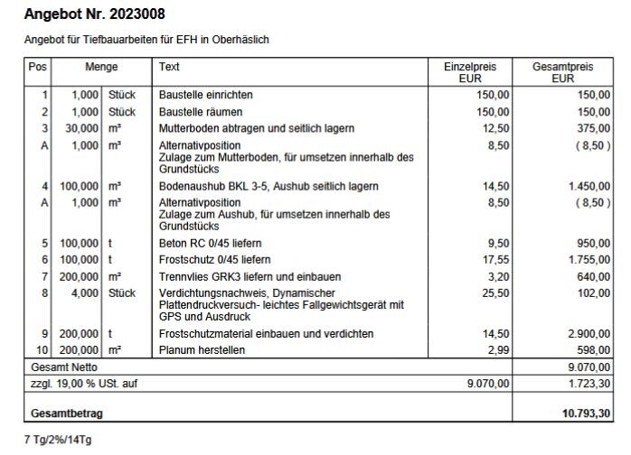 Jetzt habe ich zwei regionale kleine Tiefbauer angefragt. Der Erste (35km Enfernung) arbeitet auf Stundenbasis (650 € netto/8h inklusive Bagger, Fahrer und Rüttelplatte). Der andere hat mir ein Angebot nach m²/m³ erstellt. Das Angebot ist absolut fair, er wohnt etwas 5km entfernt und ist auch im Gemeinderat aktiv. Das Angebot anbei. Für was würdet ihr euch entscheiden? Bei Tiefbauer nach Stunde kümmere ich mich um die Anlieferung des Schotters, da bekomme ich RC-Schotter für 13,08€/t inkl. Anfahrt und 17,85€/t für FSS vom Conainerdienst.