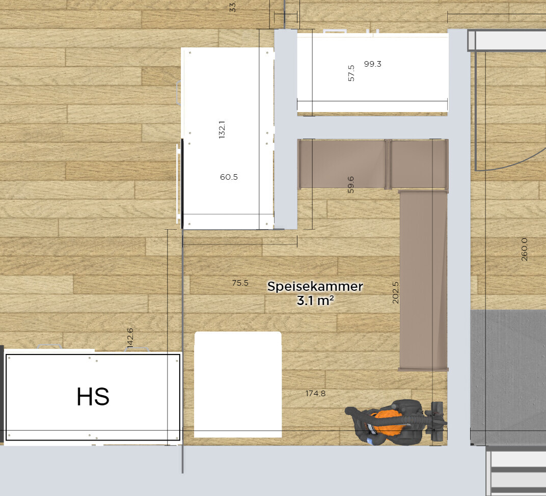 Bei der Speisekammer war die Inspiration eine Küche aus einem Thread hier, bei welcher die Speisekammer bzw der Eingang in die Küchenfront integriert ist,. Nachdem ich mir die Bilder nochmal angeschaut habe glaube ich, dass die Zwischenwände überhaupt gar nicht nötig sind und wir einfach nur raumhohe Hochschränke brauchen. Also mein Fehler, hab das nicht sauber abbgebildet:Ich weiß nicht, was @kbt09 dazu sagt, aber diese 60er Türen sind mM nach einfach zu schmal, ohne Probleme Getränkekisten oder Backbleche dort reinzubringen. Auf dem Bild sind es 80?er Schränke.Wände brauchst Du dennoch für Steckdosen und als Anlehner/Stütze für Hochschränke. Ggf willst Du ja auch auf der Speis-Innenseite Regale anbringen.