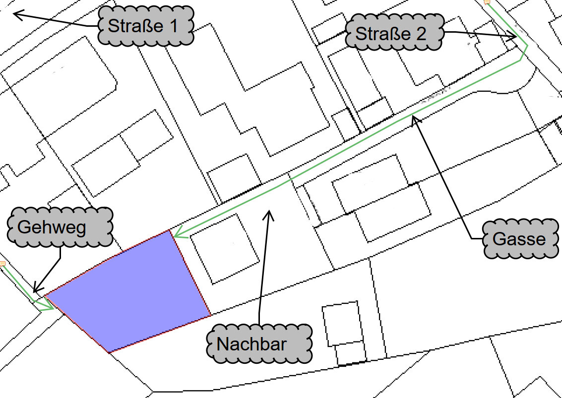 Hier aber sehe ich keine strasse wie soll das funktionieren?Die Gasse gehört der Stadt und somit ist das Nachbargrundstück mit der Gasse verbunden. Richtig, das Grundstück am Ende ist nicht direkt mit der Gasse verbunden.