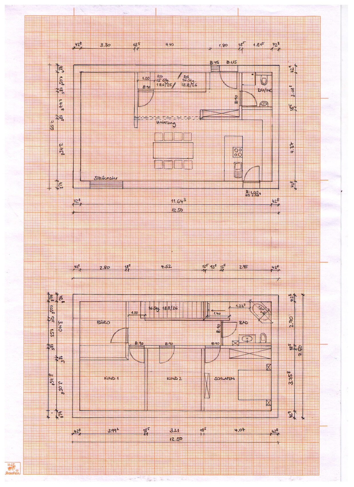 Aber erstmal muss ich Dir zum Millimeterpapier gratulieren - damit lässt sich noch am besten und effektivsten planen. Die meisten scheuen sich vor dem Mehrere-Euro-Preis, geben aber 50 für ne Software aus, die sie nicht bedienen können.An Millimeterpapier finde ich nur gut, daß sie mit 1 mm = in 1:100 10 cm dazu "erziehen", in ganzen Dezimetern zu denken: 40 cm für Außen- und 20 cm für Innenwände (die "nichttragenden" kann man immer noch im weiteren Verlauf dünner machen) sind m.E. eine praktikable "Pauschale". Noch besser finde ich klassische 5 mm Rechenkästchen - übersichtlicher, und gut abgestimmt auf den Stoßfugentakt von 50 cm beim Steinbau. Von Rensch-Haus hatte ich früher Planungsbögen mit 6,25 mm Kästchen._Yv_St_19.01.21 15:28