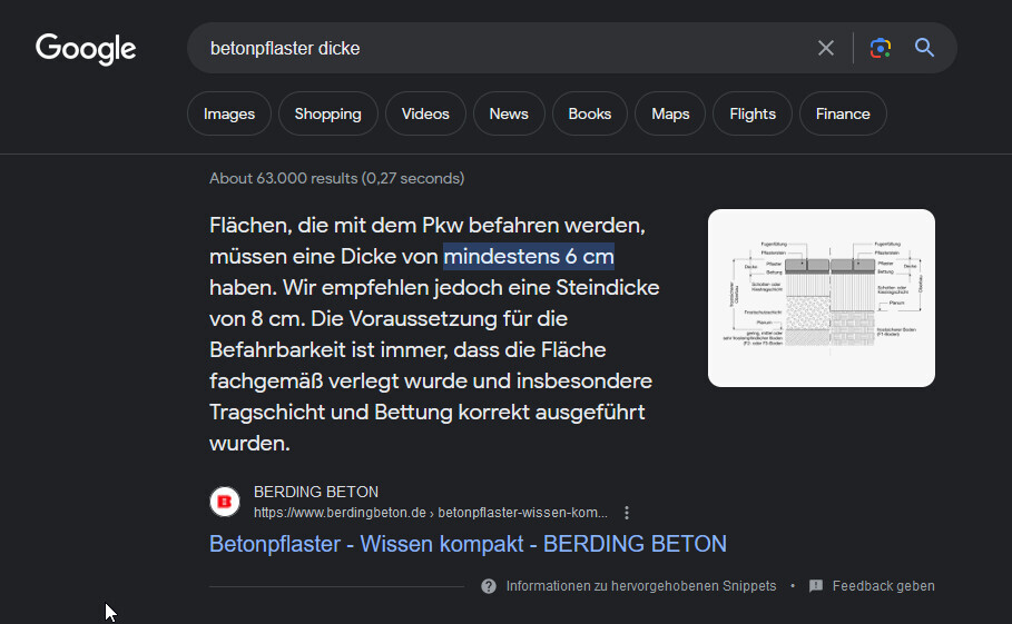 Verstehe nicht, warum hier Dinge in Frage gestellt werden, die man in einer Minute selbst bestätigen kann. Nehmen wir mal dein Hornbach-Beispiel, dann macht der Unterschied zwischen "geht gerade noch so" und "empfohlen" 4€/qm aus oder ca. 400€ für die ganze Fläche. Mit erhöhten Lieferkosten vielleicht 500€. Arbeit ist genau die Gleiche und wir reden von einem Hausbau für fast 600k, Ersparnis unter einem Promille. Vollkommen falsche Priorität hier zu sparen, dann lieber erstmal nur Schottern.