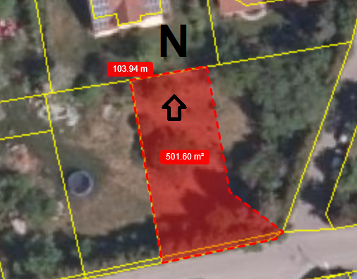 Luftbild: rotes Grundstücks-Polygon mit Nordpfeil, gelbe Grenzlinien, Fläche 501.60 m².