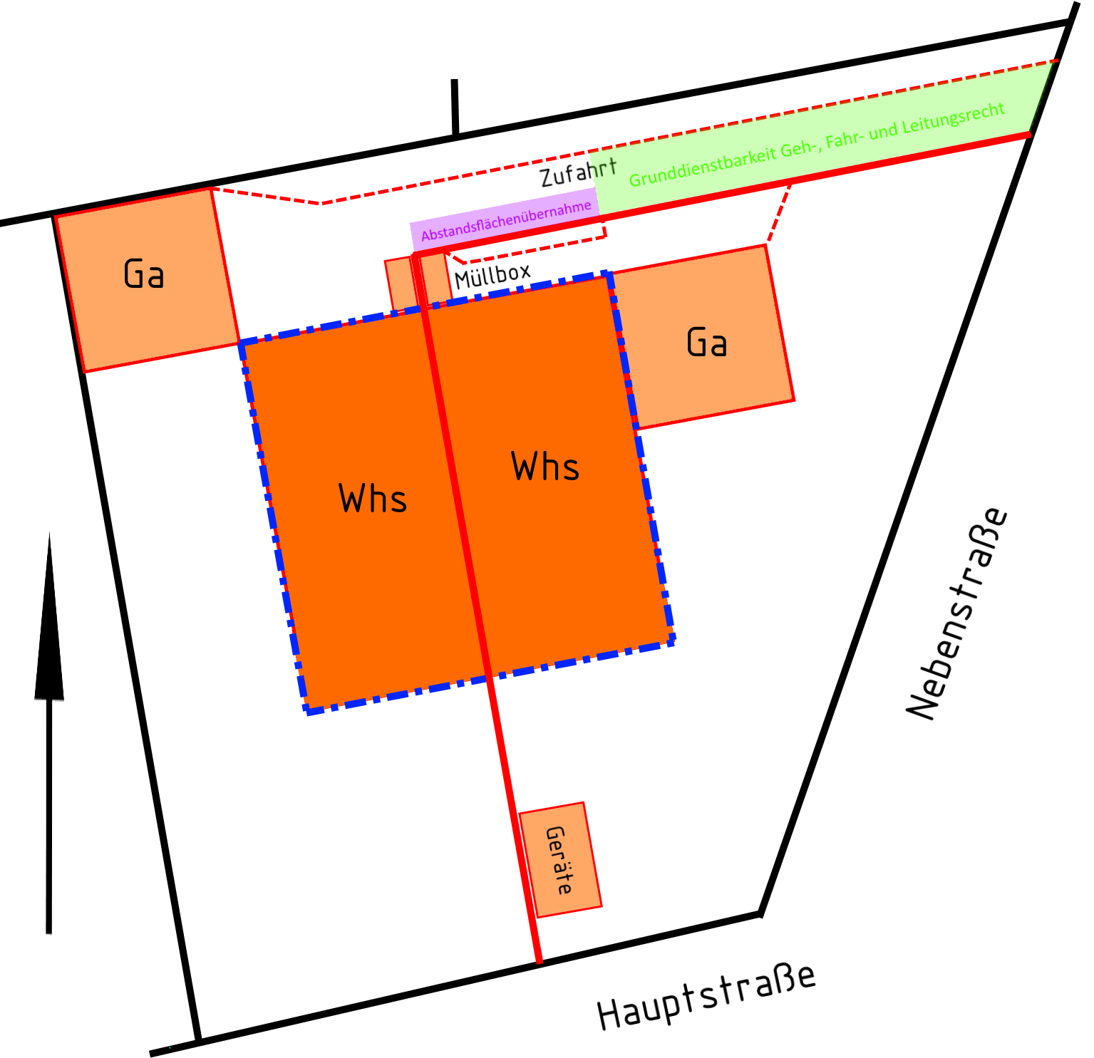 Grundstücksplan: zwei orange Whs, Ga, Zufahrt, Müllbox, Hauptstraße/Nebensstraße.