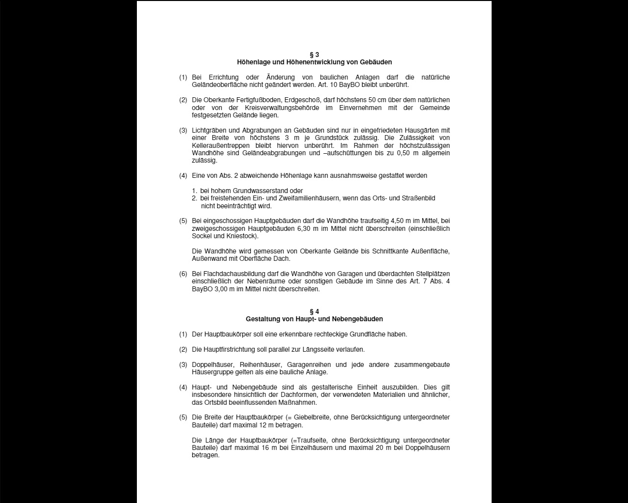 Seite eines Gesetzestextes zu Höhenlage, Höhenentwicklung und Bauregeln für Gebäude.