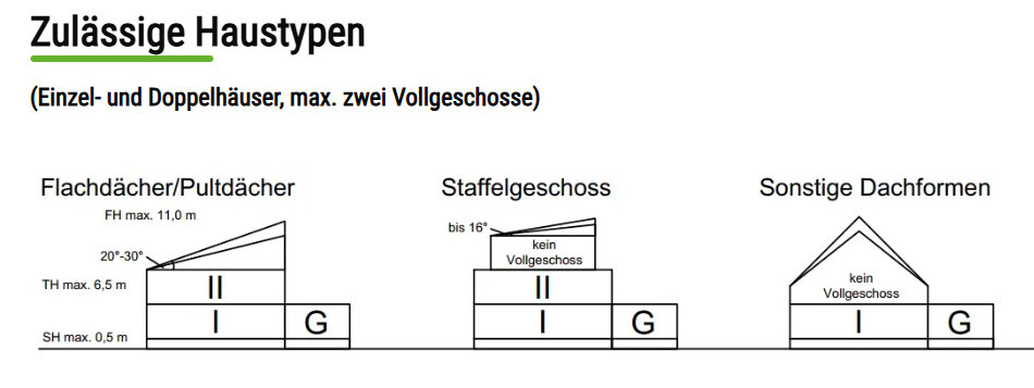 Alternativ sind Staffelgeschosse mit einem Flachdach oder einem flach geneigten Dach bis 16° zulässig, Garagen, Carports