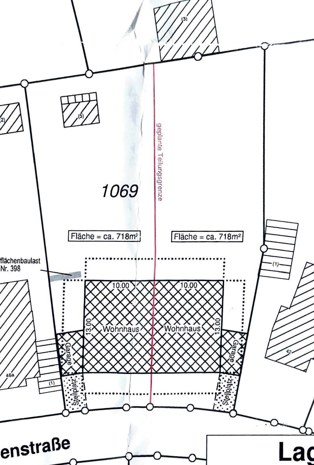Am besten zeigst Du auch ´mal einen Katasterauszug des Grundstückes, dann kann man sich die Teilbarkeit einmal bildlich vorstellen. Hätten beide Hälften einen direkten Zugang zur Straße ?Kein Problem! Beide Grundstücke haben nach der Teilung einen direkten Zugang zur Straße. Der hier eingezeichnete Platz für die Bebauung ist nur das was maximal möglich wäre unter Berücksichtigung der Baulast. Das werden wir aber nicht ausschöpfen, da unsere Haushälften "nur" um die 115m² Wohnfläche haben werden. Als kleine Hintergrundinfo: Es ist eine Hanglage, das Grundstück geht also nach hinten raus nach oben. Wir werden daher mit Keller (der die Eingangsetage darstellt) bauen müssen. Escroda schrieb: