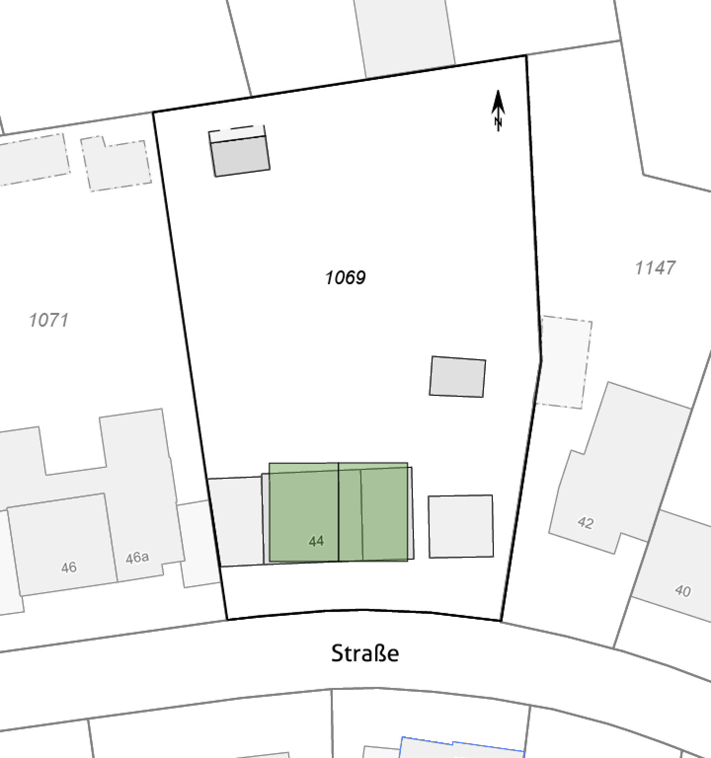 Lageplan eines Baugrundstücks Nr. 1069 an der Straße mit umliegenden Parzellen.
