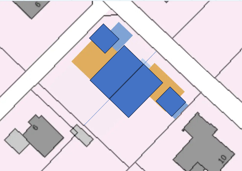 Schräg angeordnete blaue und orange Rechtecke über einer Stadtgrundstückskarte