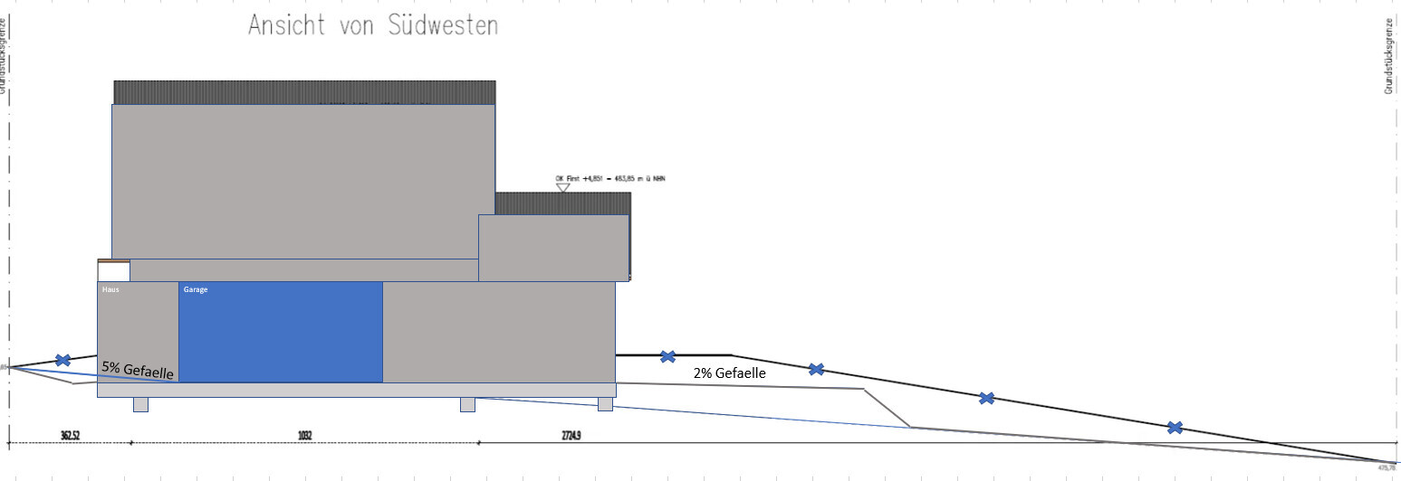 Wenn man die Garageneinfahrt mit dem Gefälle des Geländes ( 5,5%) herstellt, dann kann man das Haus und die Garage ca. 75 cm tiefer herstellen. Das macht die Außenanlage erheblich einfacher. Bitte daran denken, das man die Außenanlage schon grob herstellt. Denn mit einem Bagger kommst nicht mehr am Haus vorbei.