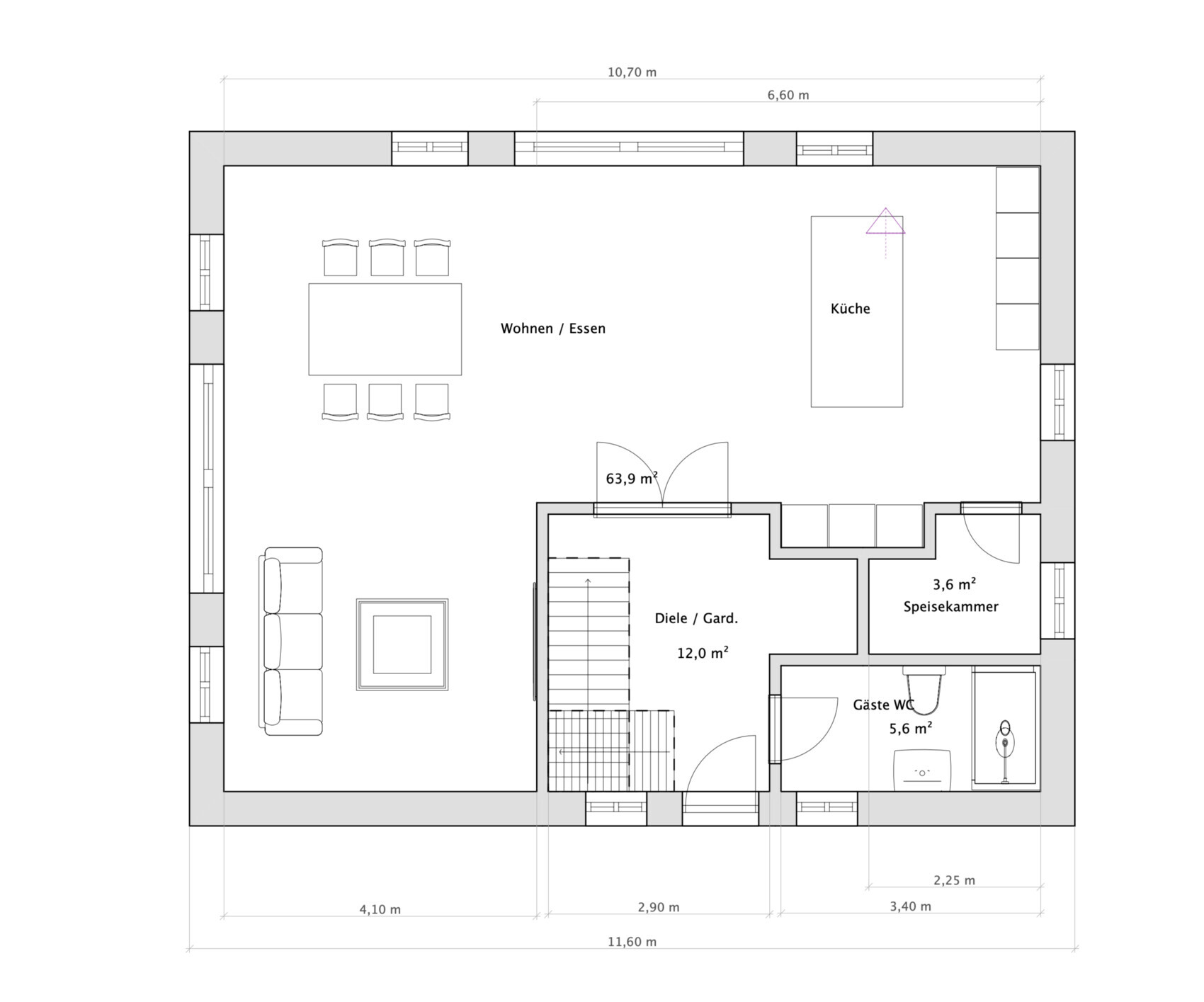 Grundriss eines Hauses: offenes Wohnen/Essen mit Küche, Diele, Gäste-WC, Speisekammer.