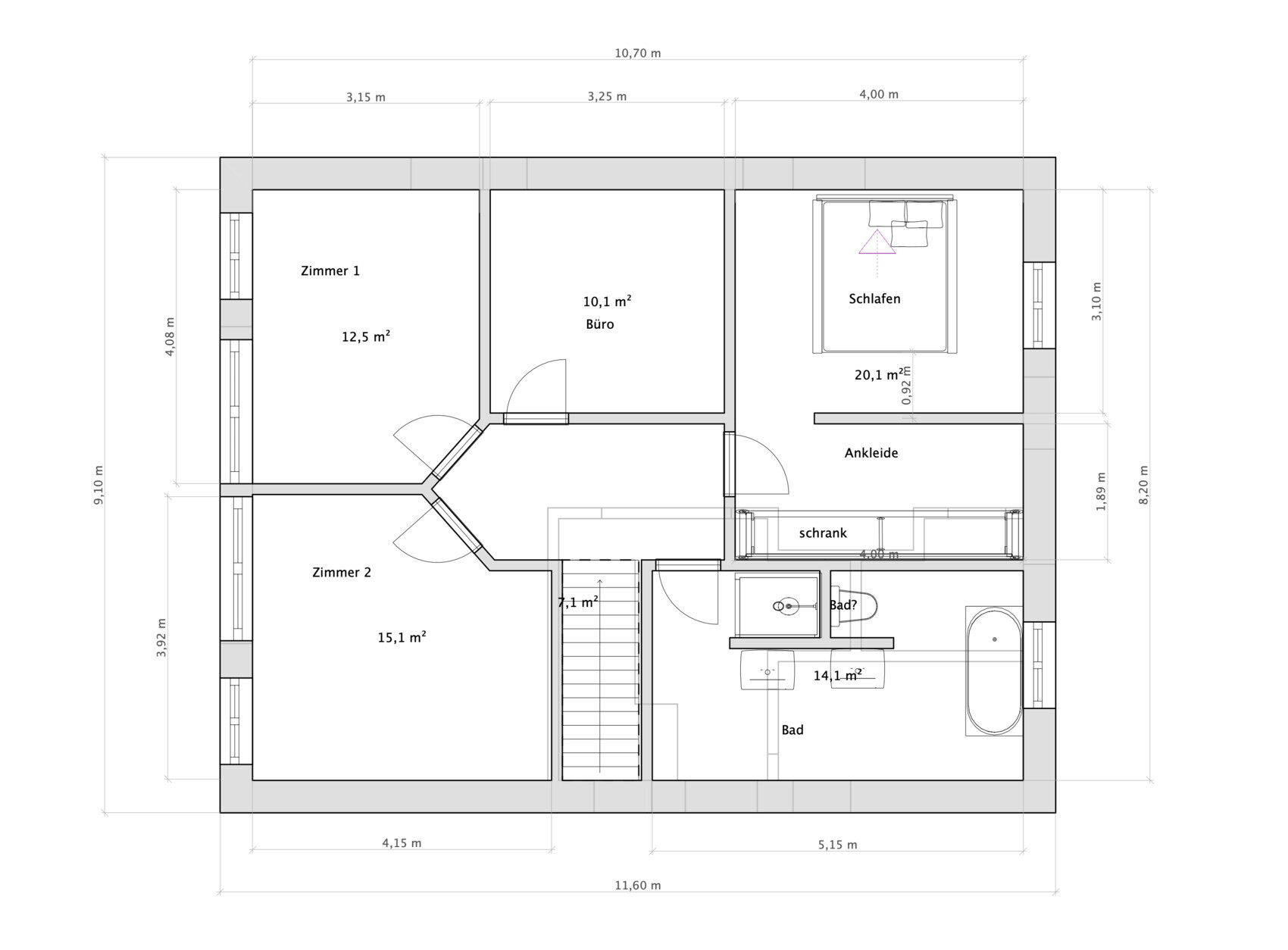 Grundriss eines Wohnhauses mit Zimmern, Büro, Schlafen, Ankleide und Bad.