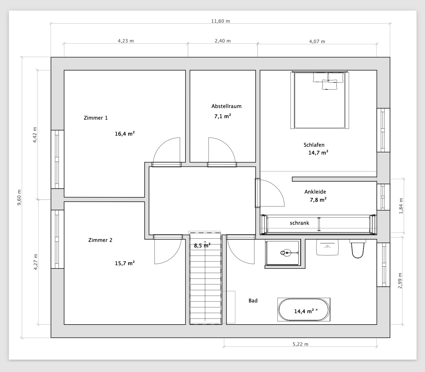 - nun 9,60 breit, das ist gerade im OG sehr hilfreich, Bad müsste so passen mit 2 Meter Linie etc.