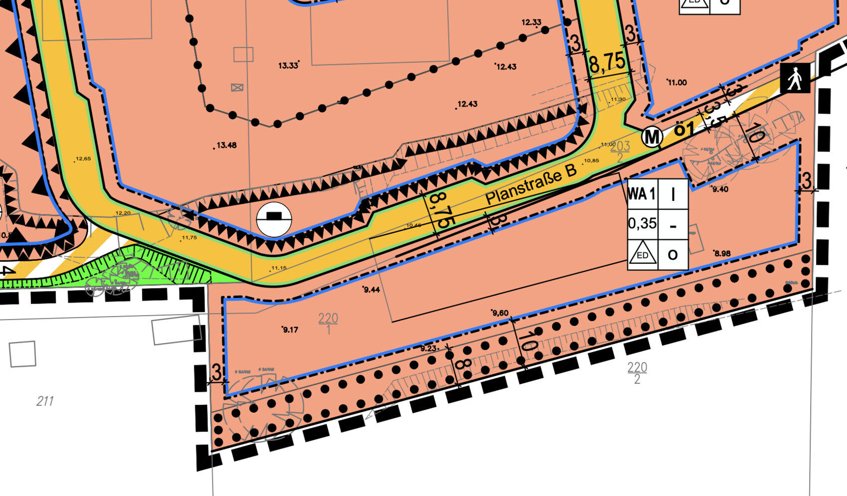Oberhalb der "Planstraße B" gibt es hier diese nach außen gezackten Linien. Die hellgrauen Linien da drunter zeigen eine auf dem Gelände aktuell vorhandene Böschung. Der gezackte Bereich bedeutet laut Erklärung: