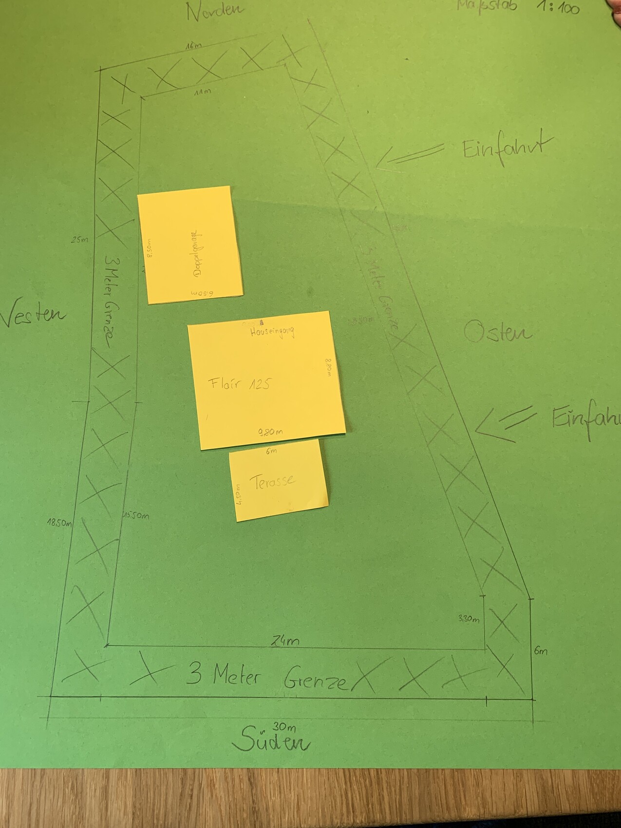 Ich hatte es aufgemalt und vermaßt und fertig und dann dachte ich, machst noch die 3m Grenze und ab dann waren die davor geschriebenen Maße schon falsch. Alle Maße wären -3m in der Länge und -6m in der Breite aber das gibt zu viel Verwirrung.