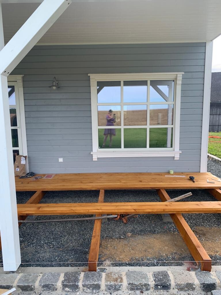 Eigentlich wollten wir von Anfang an eine Holzterrasse, uns wurde von vielen Seiten angeraten wegen der Dauerhaftigkeit doch Stein zu nehmen. Wir sind bei der Holzidee geblieben und haben uns informiert. Die Bretterpreise (der üblich "verdächtigen Hölzer") waren uns zu teuer- dachten wir.