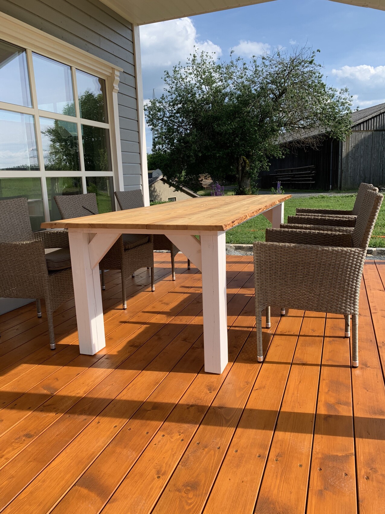 Die Bretter haben wir gefühlt jedes 100x durch die Hobelmaschine gelassen um von 5cm Stärke auf 4cm zu kommen. Dann jedes Brett x mal rundumgestrichen... Mein Mann hat dann diese zickigen stellenweise in sich verwundenen Bretter auf die Balkenkonstruktion geschraubt. Es wäre mit gekauften Brettern echt einfacher gewesen. naja, hinterher ist man immer schlauer.
