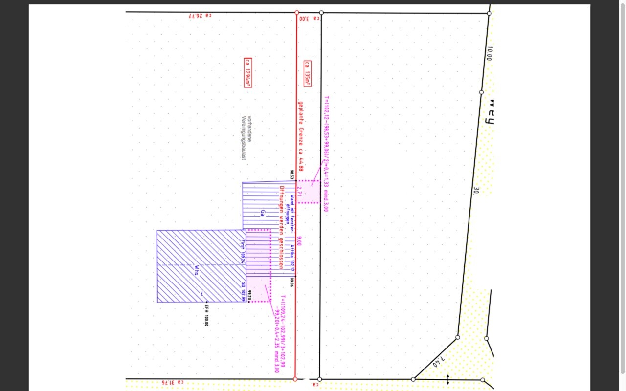 Vor ca. 2 Jahren haben die Schwiegereltern das Baugrundstück vermessen und teilen lassen, um es meiner Frau zu überschreiben. Die neue Grenze sollte genau an der Garage entlang verlaufen. Allerdings gab der Vermesser an, dass dies nicht möglich sei, da die Garage zu lang und zu hoch für einen direkt anschließenden Grenzverlauf sei und zudem noch Fenster habe. Also haben die Schwiegereltern einer Teilung der Grenze 3m entfernt von der Garage zugestimmt. Leider erfolgte dies ohne Rücksprache mit uns (wir sollten wohl überrascht werden).