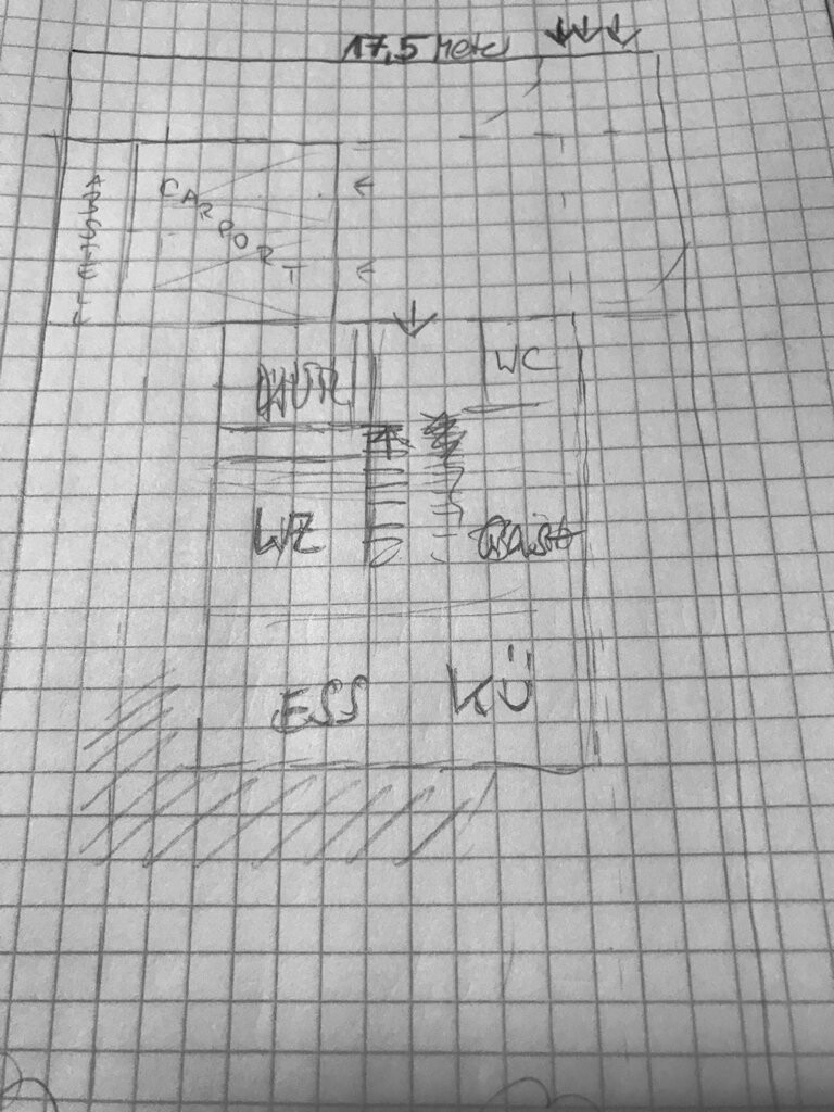 Nun, ihr seht, dass es nicht immer das Wunschgrundstück ist, welches man bekommt. Deshalb sollte man die Planung des Hauses (gern auch als Skizze auf Karopapier mit Bleistift) auch erst dann beginnen, wenn man ein oder zwei Grundstücke kurz reservieren kann.