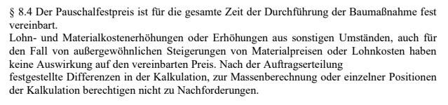 Finde ich erstaunlich. Wie will er dann die Preise halten? Gerade in der heutigen Zeit…Wir sind mit unserem aktuellen ganz gut bekannt mittlerweile und haben darüber auch mal gesprochen. Er sagte es sei schon alles immens teuer geworden. Bei ihm geht vieles wegen vorhandener Liquidität. Er hat quasi schon als wir ihm per Handschlag signalisiert haben, dass wir mit ihm bauen wollen, die Wärmepumpe bestellt. Das war Wochen vor Unterschrift. Auch sonst kauft er mehr Baumaterial auf Lager was er früher einfach so während der Bauphase gekauft hätte. Und er meinte der Rest sei sein unternehmerisches Risiko, die steigenden Preise seien absehbar gewesen und er hat entsprechend kalkuliert. Das ist ein Auszug aus unserem Vertrag: