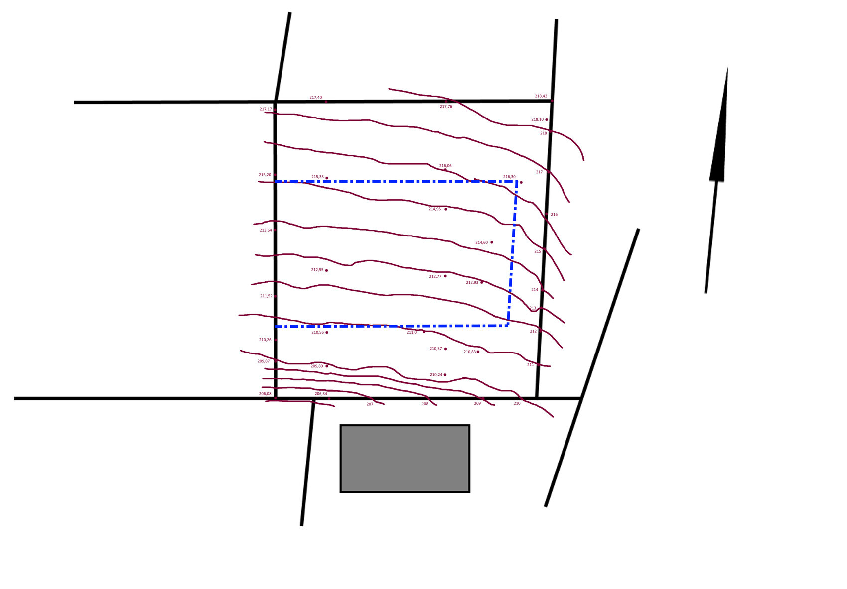 eigentlich hatte ich mir hier von Lösungsvorschläge erhofft und davon merke ich etwas wenig, derzeitDas liegt aber nicht am Fehlen der Lösungsvorschläge, sondern am Merken deinerseits. Auch antwortest Du auf Nachfragen nicht oder unverständlich, so dass es auch schwer fällt, Dir die Lösungsvorschläge näher zu erläutern. Hier mal der "nackte" Höhenplan, mit den Angaben aus Bebauungsplan und Deinem Lageplan:Hier wird - wie bereits bei der Westansicht - nochmal flächenhaft deutlich, dass sich die maximale Steigung an der Zufahrt befindet. Es ist also für einen Großteil der Erdarbeiten egal, ob Du freie Stellplätze oder Garagen planst, da hier die Steigung auf jeden Fall auf 15% reduziert werden muss. Ebenso wird klar, dass eine Ost-West-Verschiebung keine Auswirkungen auf die Erdarbeiten hat, weil die Höhenlinien nahezu exakt in dieser Richtung verlaufen.