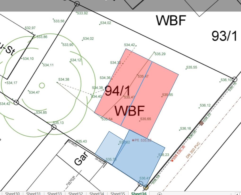 Genau. Terrasse soll unten vor das Gartengeschoss (Nachmittags und Abends schönes Licht) auf ca. 534m. Einfamilienhaus ist dann ca 536,70 m. Eine kleine Terrasse vlt noch vor das Haus in Richtung Straße für morgens Kaffee trinken. Was das Höhenniveau angeht, Straße ist ja bei ca.