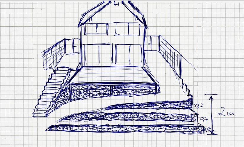 Zuerst dachte ich an eine 2m hohe Mauer (am höchsten Punkt), jedoch war mir das mit der Dimensionierung des Fundament zu heikel.