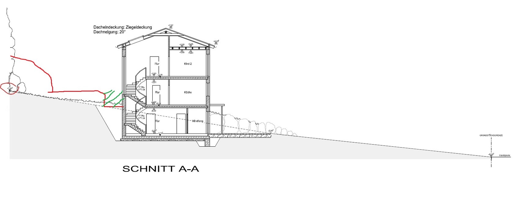 Für uns war anhand der Ansichten nicht klar das es so Steil hinten ist, wir dachten es bleibt so wie es bisher ist von der Steigung her. (Sind aktuell vielleicht so 10° die oberen 5 Meter und danach wirds natürlich steiler) D.h. wir dachten das wir wie eingezeichnet hinten im EG mit der Oberkante Fußboden auch auf der Oberkante Gelände sind.