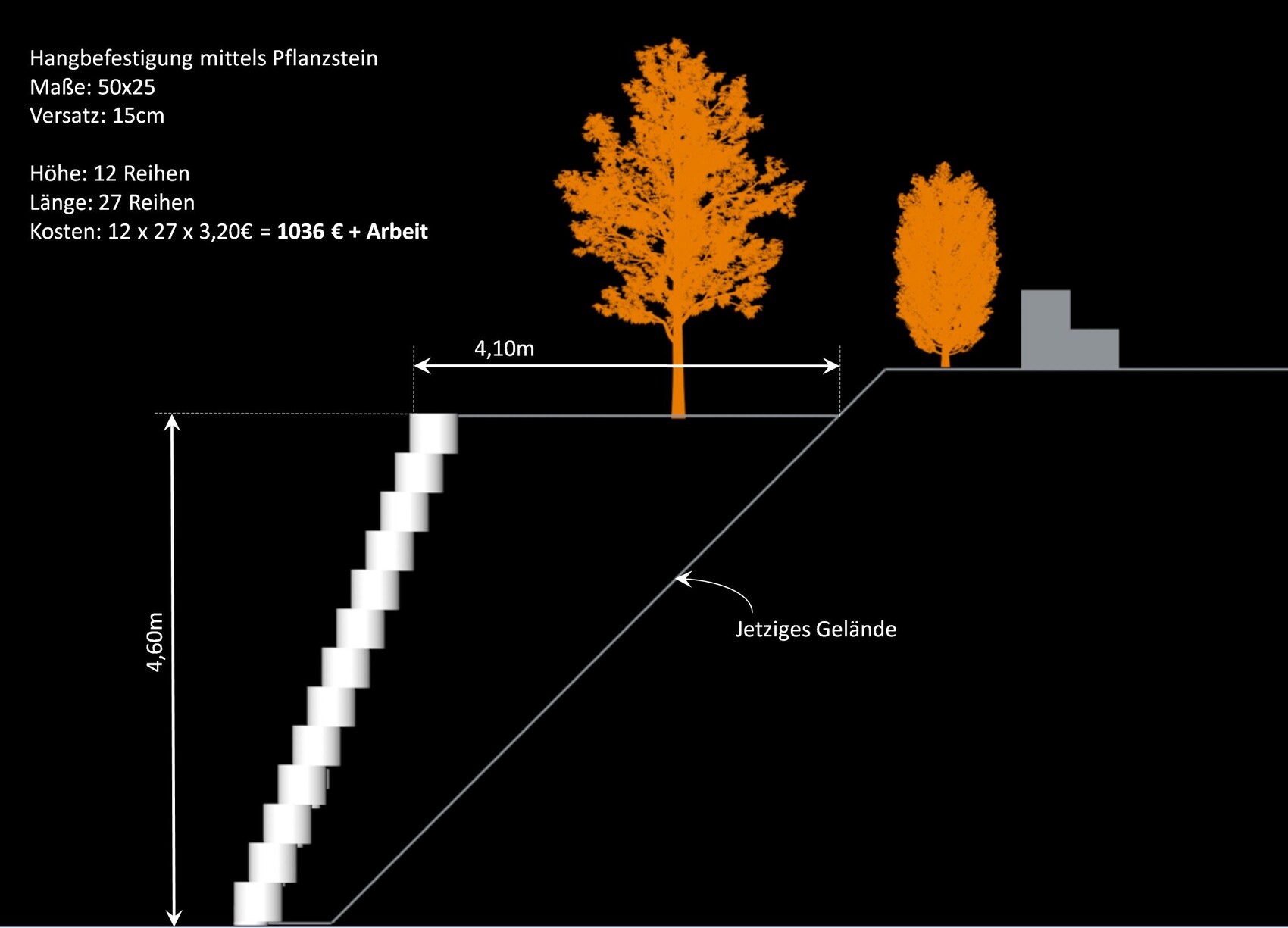 ich möchte den Hang an meinem Grundstück (27m lang) befestigen um eine nutzbare, zusätzliche Ebene zu erhalten.