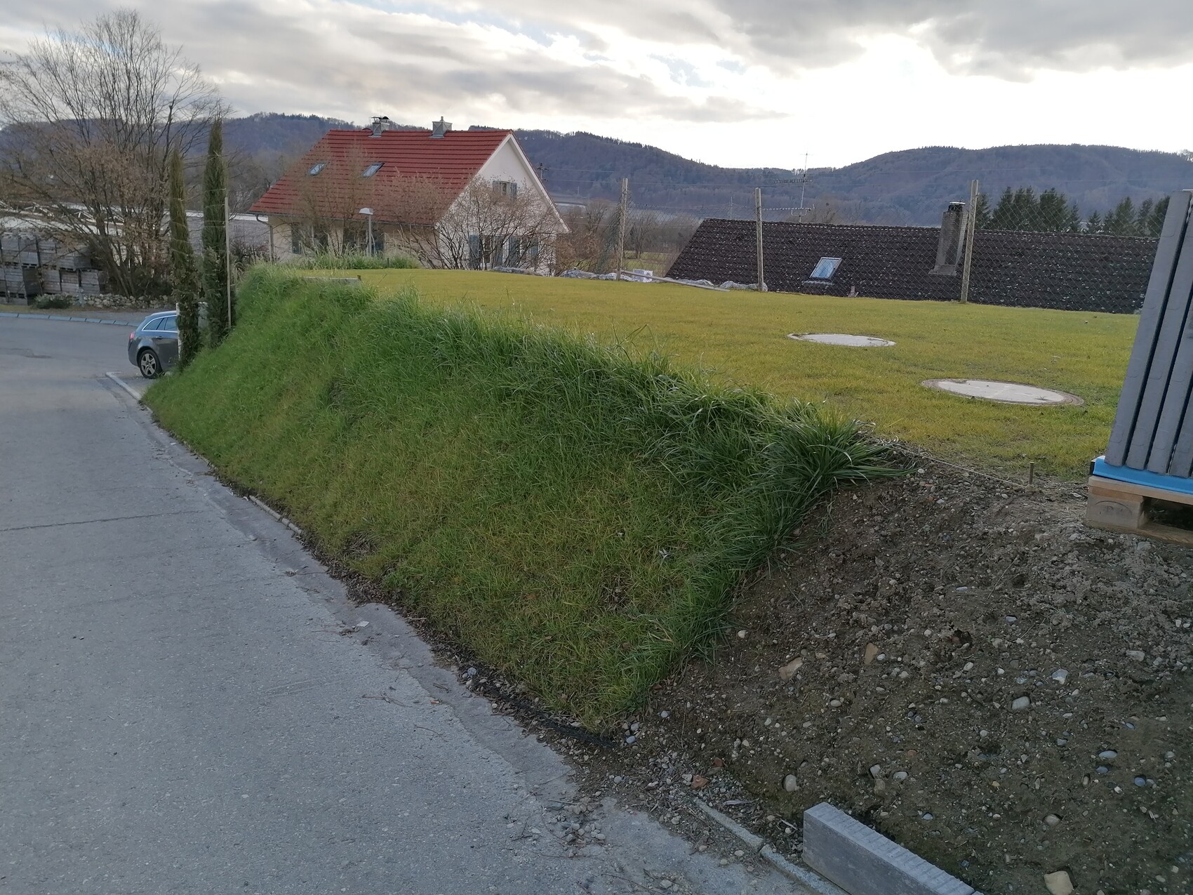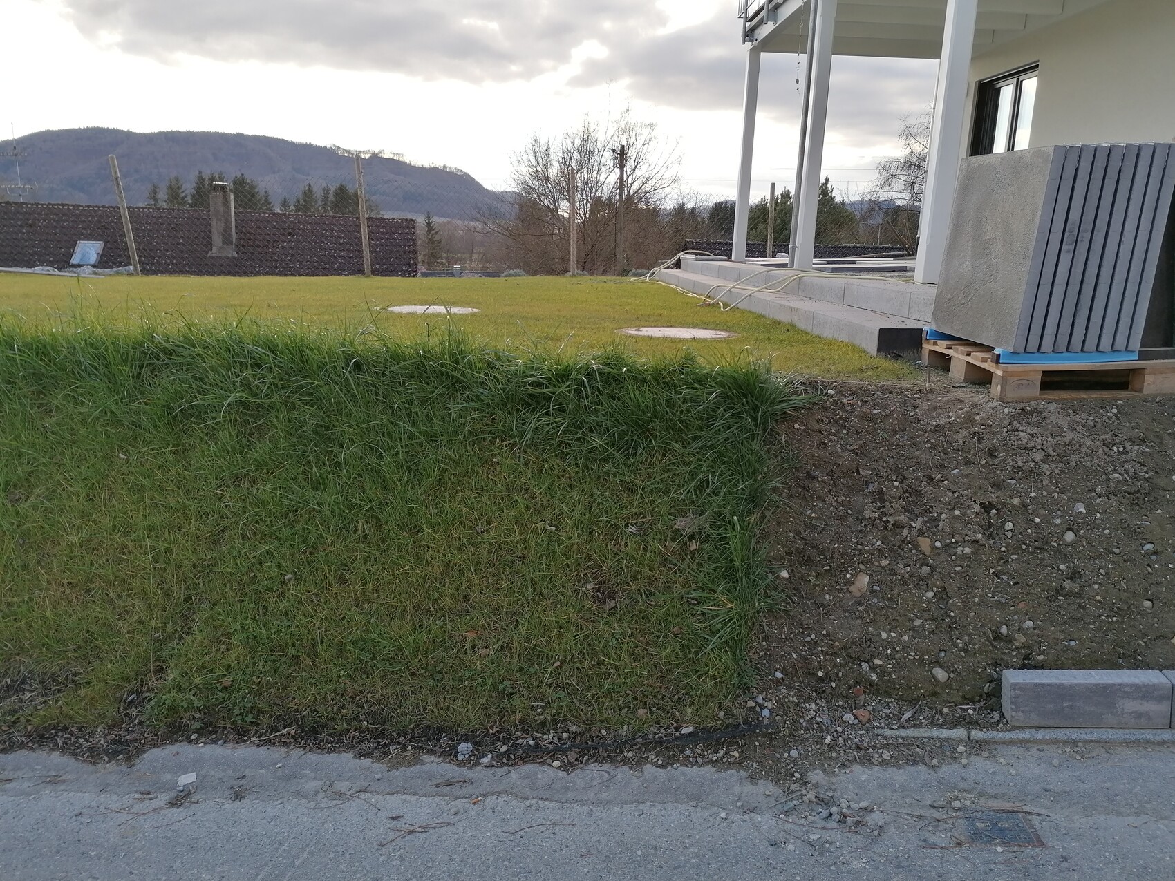 wir haben ein etwas ungewöhnliches Grundstück mit einem dreieckigen Zuschnitt und Höhenunterschieden. Ihr könnt das auf den Bildern gut sehen. Baurechtlich dürfen wir keine Einfriedung, z.B. Mauer bis an die Straße heransetzen und müssen 50cm Abstand halten. Mit einer Mauer hätten wir auf der Ebene somit kaum Fläche gewonnen. Bei einer Böschung ist das nicht erforderlich. Wir haben deswegen steil angeböscht (etwa 65 Grad) und auf der Böschung ein Rasenvlies angebracht. Der Rasen ist zwischenzeitlich verwurzelt, die Böschung hält und die Fläche ist mit Rasen bewachsen. Allerdings ist der Rasen durchzogen von Klee und sieht nicht so schön aus, wie angenommen - auch nicht frisch gemäht