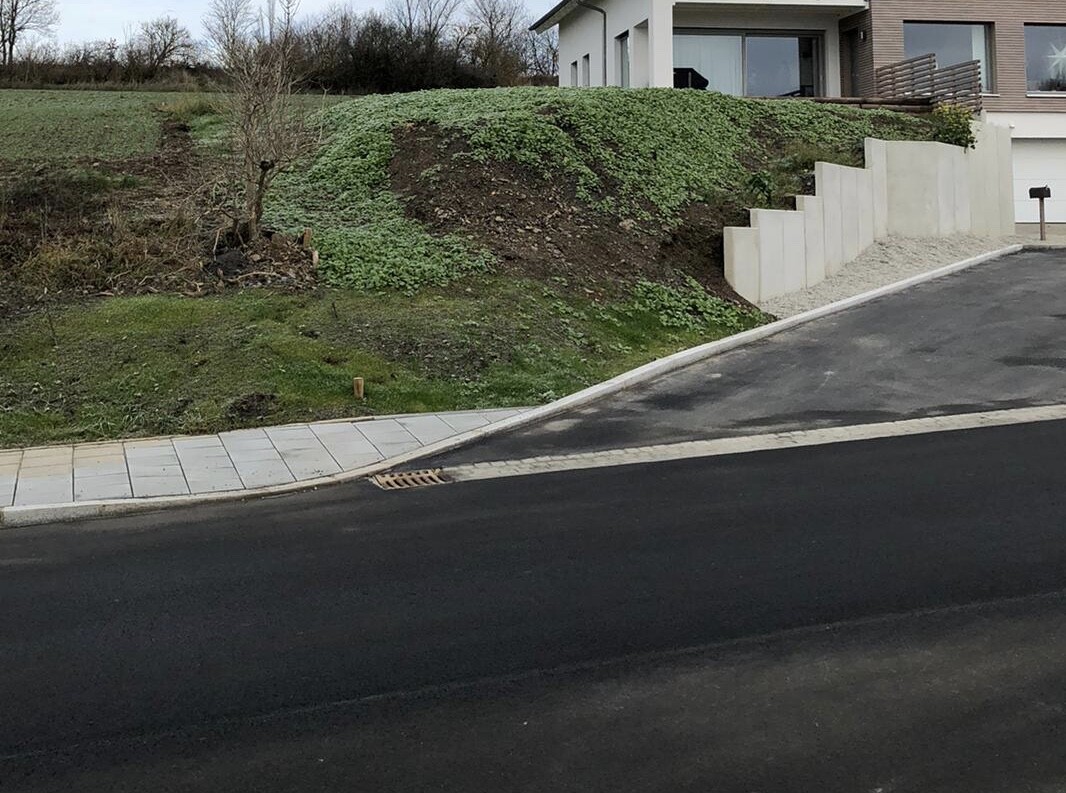 Es sieht so aus, dass Du ja schon nach 10-15 Metern auf Grundstück 1,5m höher bist als die Straße, ist das korrekt? Grundstück sieht nach 35m Tiefe aus, wenn ich mich an dem Zaun des Nachbarn orientiere.