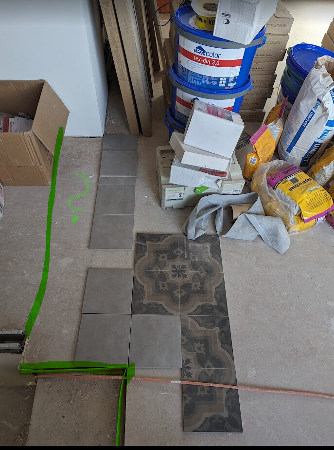 Wenn ich es verlaufen lasse wie im Foto würde die Musterfliese genau an der Treppe enden. könnte man zumindest so machen, passt etwa, haben wir eben ausprobiert. Aber dann hätten wir in unserer Umrandung eben diese Lücke.