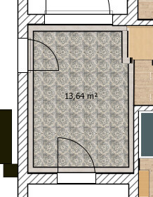 Ich hatte zuvor angenommen, die Raumecke rechts wäre weniger breit als die Treppe. Wenn ich jetzt die neutrale Fliese vor der Treppe enden lassen kriege ich dort so einen 20cm freien Streifen.