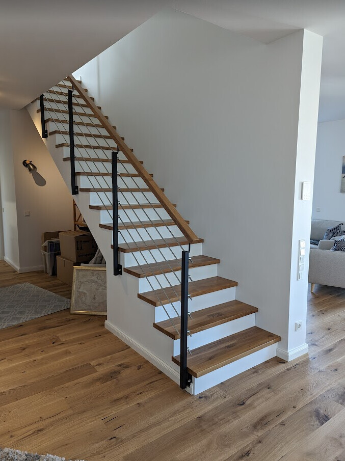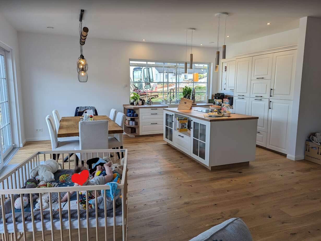Bleibt die Lampe im WZ oder ist das ein Bau Provisorium? Gardinen?Die Lampe bleibt. Für ein Provisorium war die zu teuer. XD Wir haben wirklich ewig rumüberlegt was wir da hinmachen, aber mir war an der Stelle Pragmatismus wichtiger als Optik. Wir haben ja schon Pendellampen über Insel und Esstisch, und in der TV-Ecke wollte ich auf jeden Fall etwas haben, was keine Reflexionen im Fernseher erzeugt. Eingestellt werden damit sie in die richtigen Ecken leuchtet muss sie aber noch.Gardinen wissen wir noch nicht. Im alten Haus hatten wir welche, aber damals gab's hier auch geteilte Meinungen. Die einen finden's altmodisch (wäre mir egal, meine halbe Einrichtung ist "altmodisch"), die anderen gut.