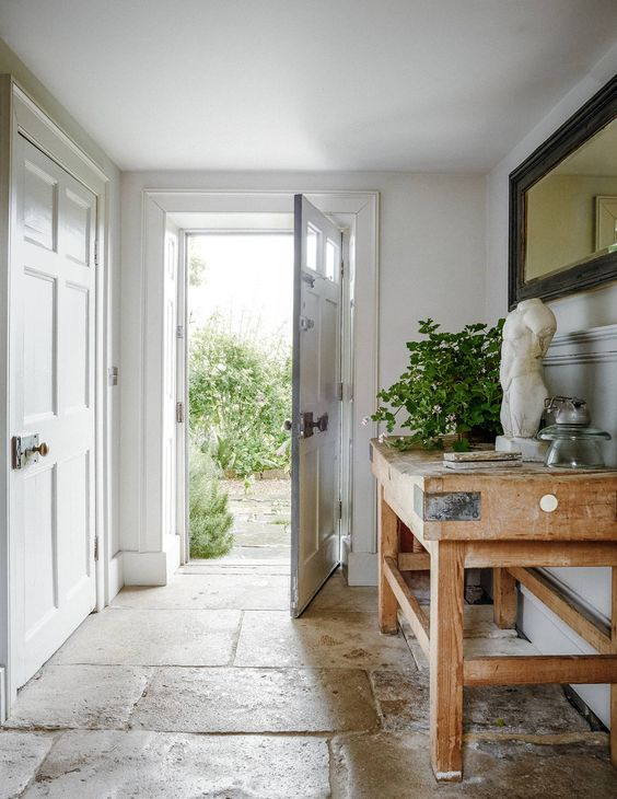 Heller Eingangsbereich; offene Tür zum Garten, Steinboden, Holzwerkbank mit Pflanze und Skulptur.