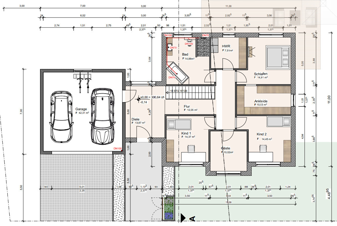 Bezüglich Küchenwand: Finde die schon gut, weil man sonst auf die Seitenteile der Küchenhochschränke zuläuft. Allerdings hätte ich sie weiter nach planlinks gerutscht und die Treppe ebenfalls nach planlinks gerutscht. Warum die nicht bei der Außenwand beginnt, ist mir unklar. So ergäbe sich eine deutlich größere Küche. Das Sofa würde ich an die Innenwand stellen, sonst steht es vor dem Fenster und du guckst gegen eine Wand anstatt in den Garten. HAR braucht mE keine Tür vom Flur aus. Das reicht durch Gartengeräte und evtl zusätzlich durch Fitness. Da musst du ja so gut wie nie rein. Dann könnte das Bad mehr Platz erhalten. Unten ergäbe sich durch die verschobene Treppe ein etwas breiterer Flur. 1 Meter finde ich schon grenzwertig - auch um mit den Möbeln ums Eck zu kommen. Weiß aber nicht welche Wände bei dir schon stehen ;-)