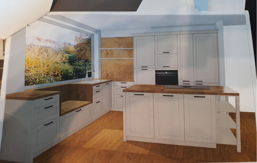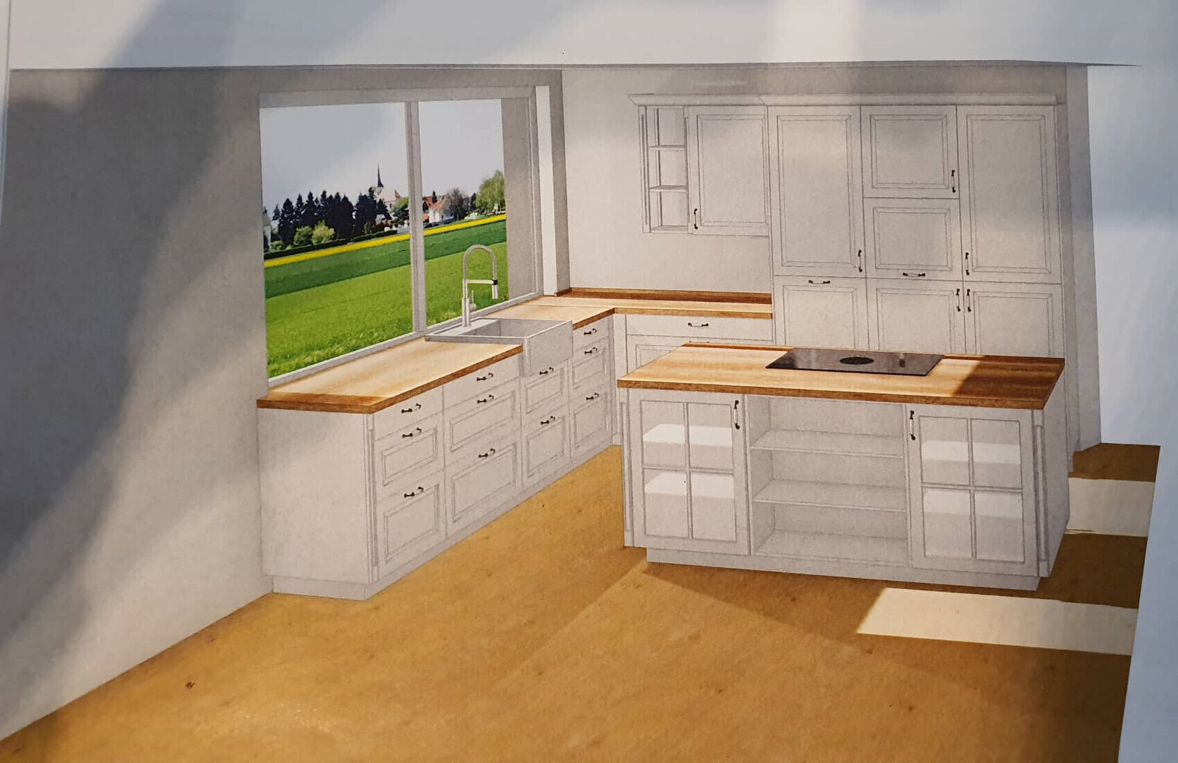 Von meiner geliebten / erträumten Sitzbank vor dem Panoramafenster haben wir uns zwischenzeitlich verabschiedet. Ich fand die Idee wunderschön, aber dafür müssten wir so viel Arbeitsfläche aufgeben, dass kaum noch welche übrig bleiben würde.