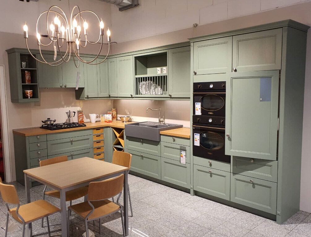 Ach ja, und zu allem Überfluss haben wir heute auch noch eine wunderschöne Küche von Schüller entdeckt. Ich hatte mich so darauf eingeschworen mich nicht wieder von irgend einer Modefarbe (zuletzt schwarz 😀 ) von meinem magnolienfarbenen Landhaustraum abbringen zu lassen. Und dann haben wir dieses Schätzchen hier in Schilfgrün entdeckt. Die schmachte ich ja schon ein bisschen an. Ein Teil von mir fragt sich, ob ich die in 5 Jahren immer noch so gut leiden mag. Ich war jedenfalls genug davon angetan, dass der Berater uns die noch mal rechnet.