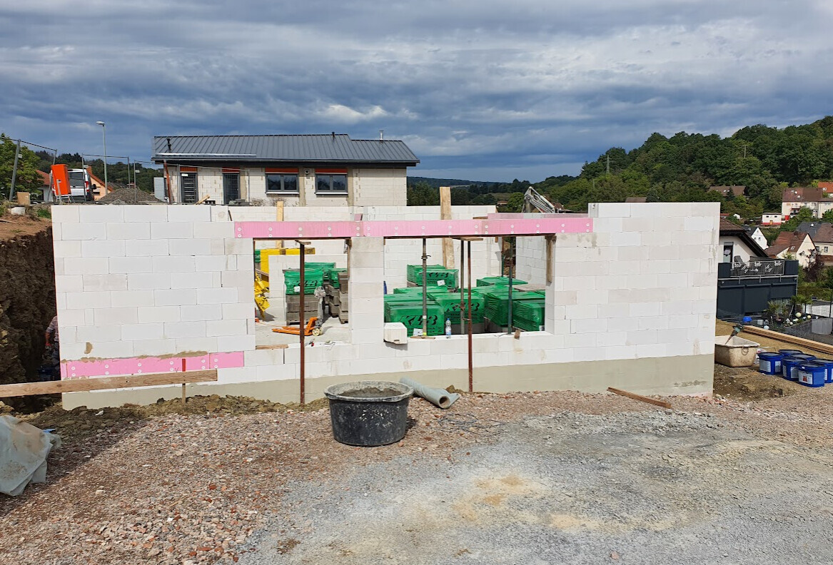 Die Innenwände sind noch ein ein paar Tage Arbeit sagte unser Bauunternehmer heute. Ansonsten heißt es dann erst mal warten auf die Betondecke, die kommt erst Mitte Oktober. Früher war nichts zu machen. Danach geht es dann weiter mit dem 2. Geschoss und dann den Dachbalken.