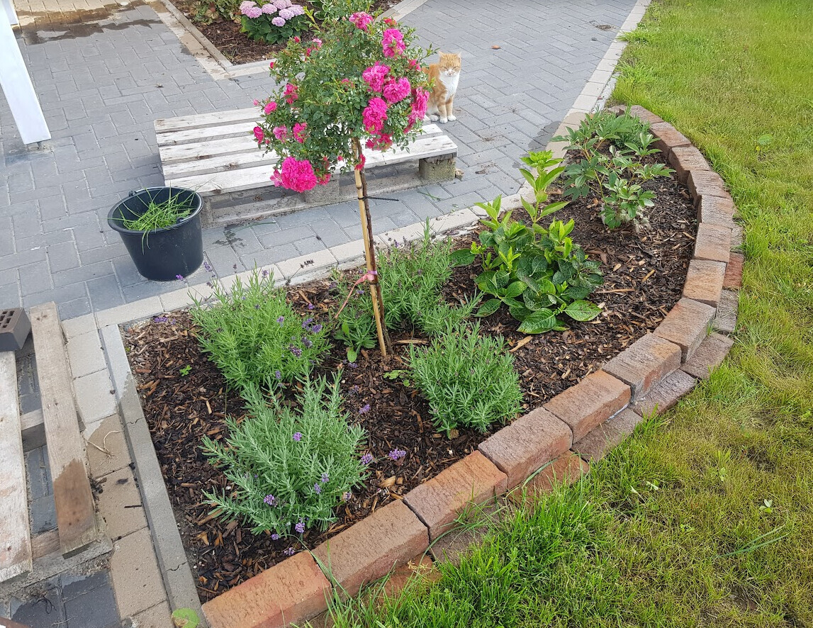 Wir haben beim ersten Haus ein bisschen was selber gemacht. Was wir gut selber können ist Beete anlegen und Sachen pflanzen. Ich hatte auch ne Beeteinfassung mit eingebuddelten Klinkersteinen gemacht auf die ich recht stolz war.