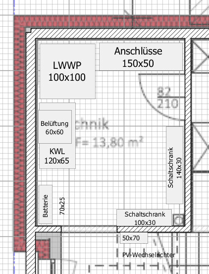 Nunja, Du sprichst zwar elementare Techniken an, die zu einem Haus gehören, das findet in ü12qm sicher Platz. Wo aber befinden sich die Waschmaschine, Trockner, Stauraum für so vieles: Werkzeug, Putzzeug, Deko... hast Du dafür andere Räume oder was?Ja, dafür gibt es extra Räume. Der Raum hier soll wirklich nur für Heizung und Co sein. Wir haben dann noch eine Speisekammer, Abstellkammer und sonstigen Stauraum.Wenn ich das hier so richtig lese, sollte es zwar in den Raum eng werden, aber es sollte klappen. Notfalls kann man noch einen Mauerstummel einbauen. Wir haben noch einen alternativen Plan, wo der Raum noch einmal 50cm länger ist.