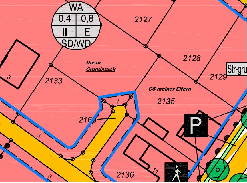 Zum Grundstück 550 m2, Hanglage, wobei ich das Gefälle überhaupt nicht abschätzen kann. Es ist nicht extrem, muss mal meine Eltern fragen ob die zu ihrem Grundstück da eine Angabe zu haben. Das Grundstück 2135 ist meinen Eltern 2134 ist uns und 2133 dem Bruder meiner Mutter, der dort nicht bauen wird und wenn er es verkaufen will erst uns fragen würde.