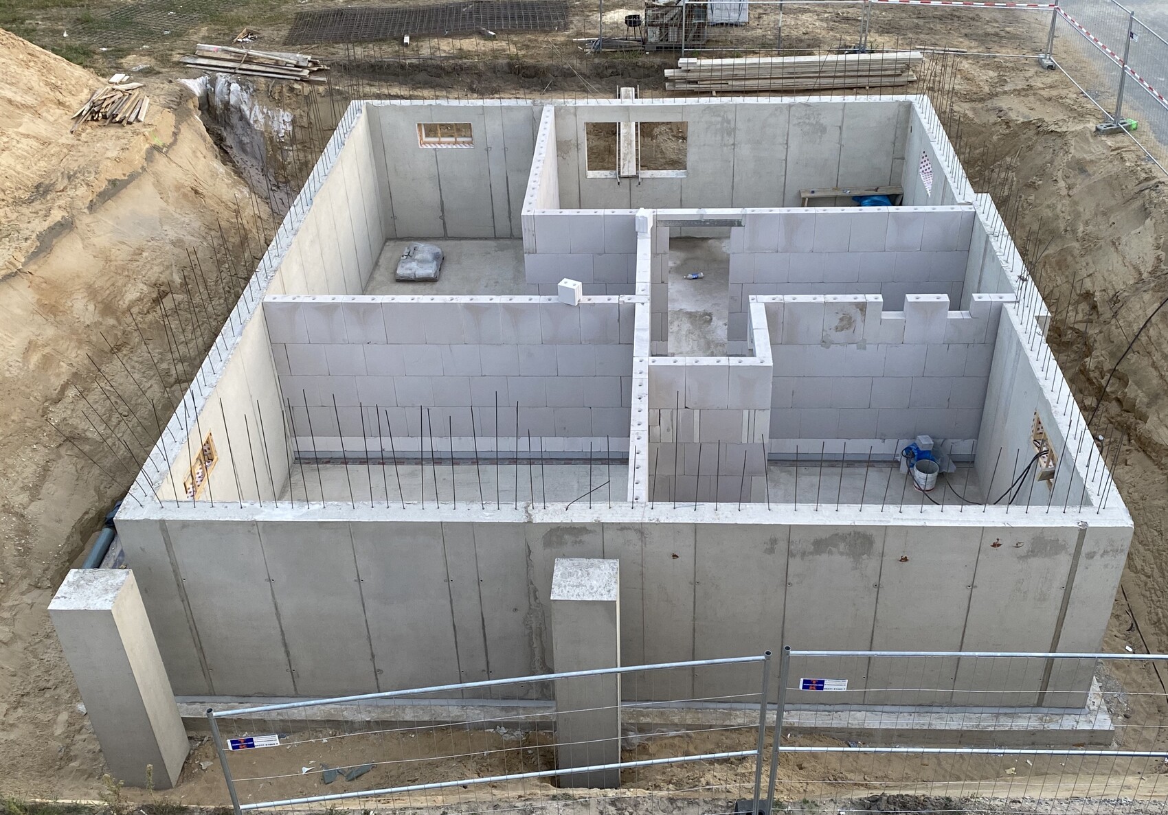 Fundament eines Gebäudes: Betonmauern, Innenwände, Bewehrung ragt, Bauzaun ums Gelände